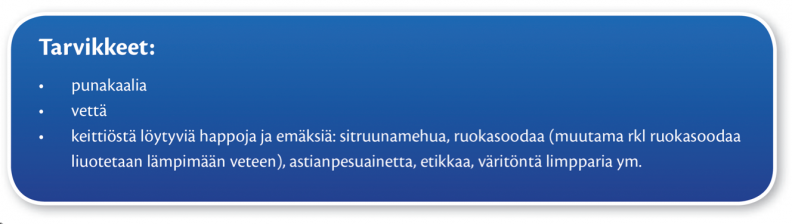 Vaikeustaso: Keskitaso. Kesto: Esivalmistelu 15 min, seisotusaika väh. 1 h, varsinainen koe 30-60 min. Erityistä huomioitavaa: Punakaalimehu voi värjätä pintoja tai vaatteita. Varottava kuumaa vettä ja etikkaa (opettaja käsittelee).
